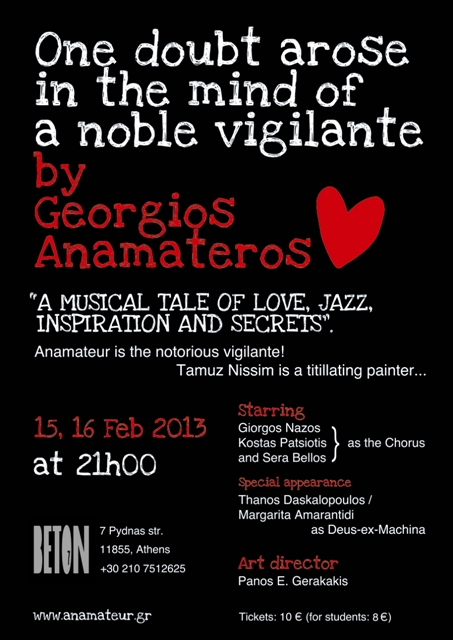 Starring: Anamateur (p, voc) as the Noble Vigilante, Tamuz Nissim (voc, p) as the inspired painter, Giorgos Nazos (g, tp),