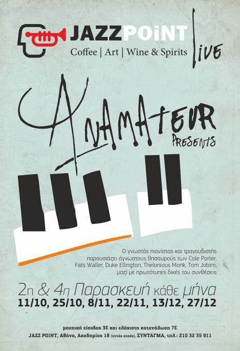 Anamateur will be a member of Priamos Morakis' house band, singing and playing piano, along with Alexios Antonopoulos (dr) and Barry Zealy (b).