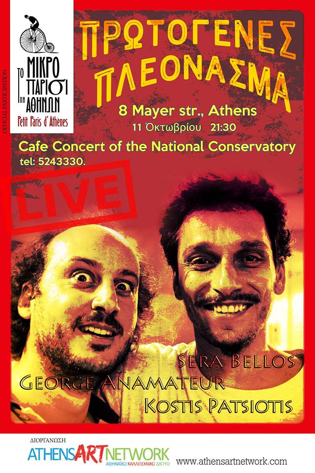 Dr. Bellos and Anamateur, accompanied by Kostis Patsiotis (cb) and Konstantinos Stouraitis (g) will participate in this new theater-oriented festival named "Petit Paris d' Athènes", organised by "Athens Art Network" (in its first year of running, the festival will be dedicated to the memory of Albert Camus (dates: from 9 to 16 October)). The concert's repertoire will include unknown treasures by Fats Waller, Cole Porter, Thelonious Monk and some of Anamateur's own little tunes.