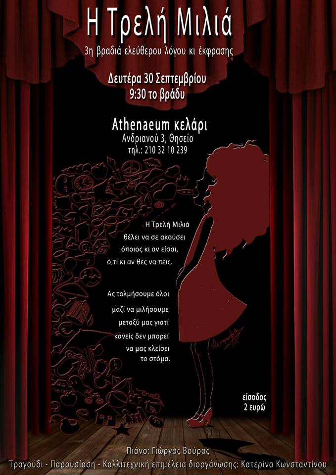 The time has come at last for Anamateur to read in public mr. Mohamed Yakamoto's brilliant questionary for an amateur wanting to make business with the pros... His amphitryon will be mrs. Katerina Konstantinou and her creative literary project named (how else?) "Treli milia" ("Crazy talking"). Apart Anamateur and other crazy talking people, there will be George Vouros on the piano and some jazz songs will be heard.