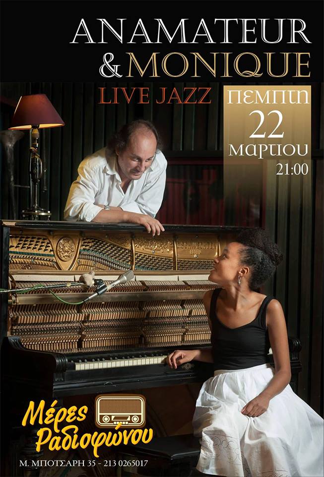 In the morning of New Year's eve, Anamateur & Pros pres. Monique will give a performance as part of Nea Smyrni municipality's festivities regarding pedestrianization of Omirou str. Anamateur's team will include Priamos Morakis (g), Yiannis Papanastasiou (asax), Periklis Trivolis (cb), Vassilis Panayotopoulos (dr) and Monique Kabasele (voc).