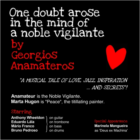 With: Georgios Anamateros (piano, vocals, melodica / Noble Vigilante), Marta Hugon (vocals / "Peace" the Painter), Mário Franco (double bass, vocals / Vigilante accomplice), Bruno Pedroso (drums, vocals / Vigilante accomplice), Anthony John Wheeldon (guitar, vocals / Vigilante accomplice), Eduardo Lála (trombone, vocals / Professor Nontalent), Marinela Mangueira (tap dancing / newspaper girl).